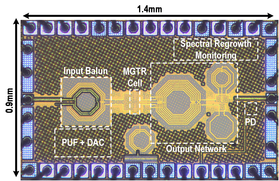 ![]() | PUF-Controlled PA Spectral Regrowth for RF FingerprintingDesigner: Qiang Zhou, Yan HeGF 45nm CMOS SOI, Apr. 2020Publication: ISSCC 2021, T-MTT 2024, ICC 2024 |
